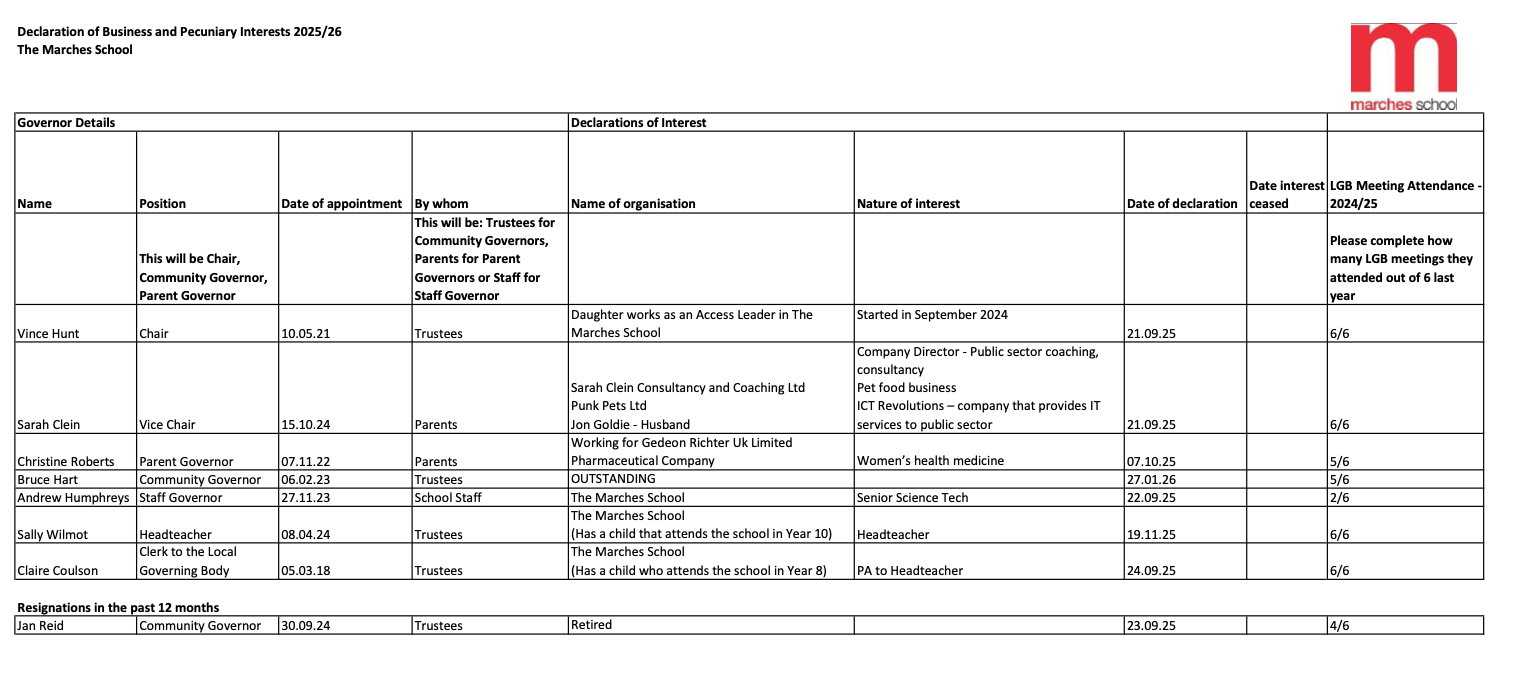 All current and prospective Governors should have read the Marches Academy Trust Governors Handbook, the Governor Code of Conduct and Scheme of Delegation.
